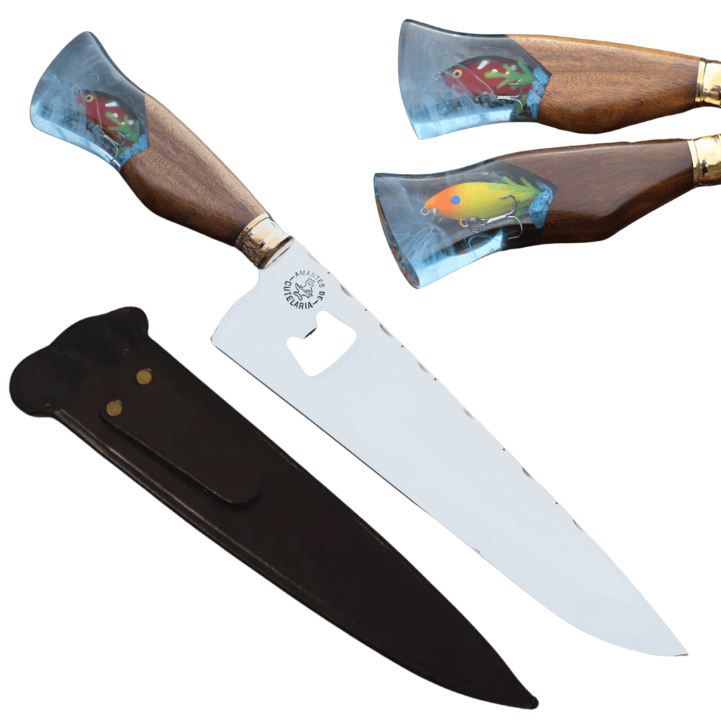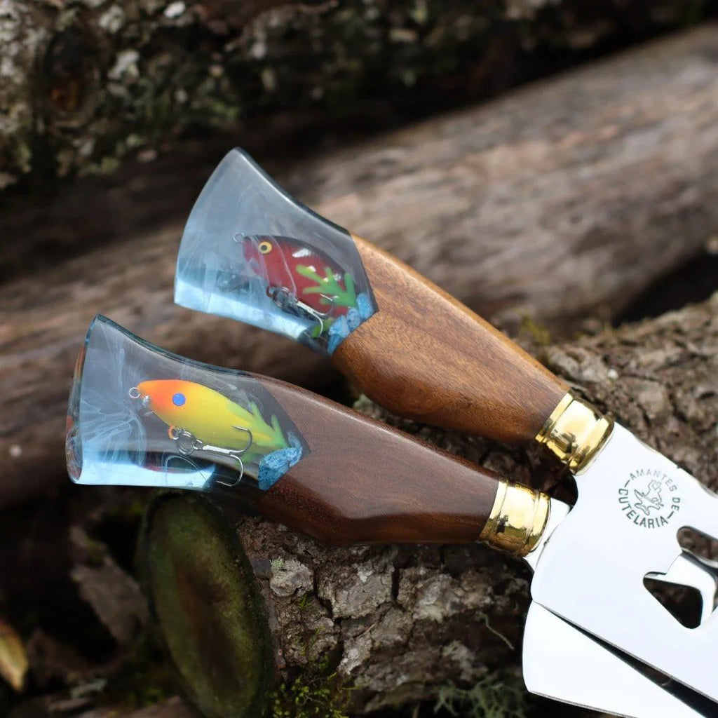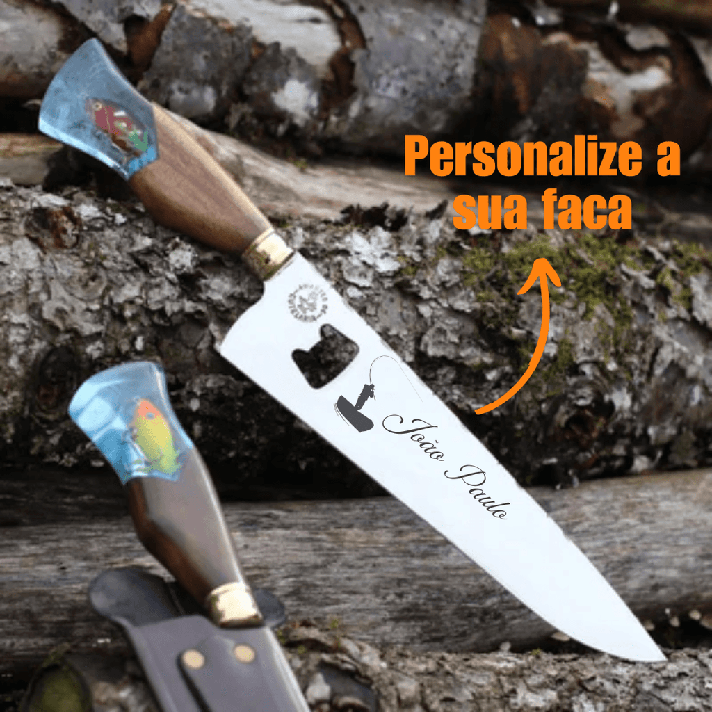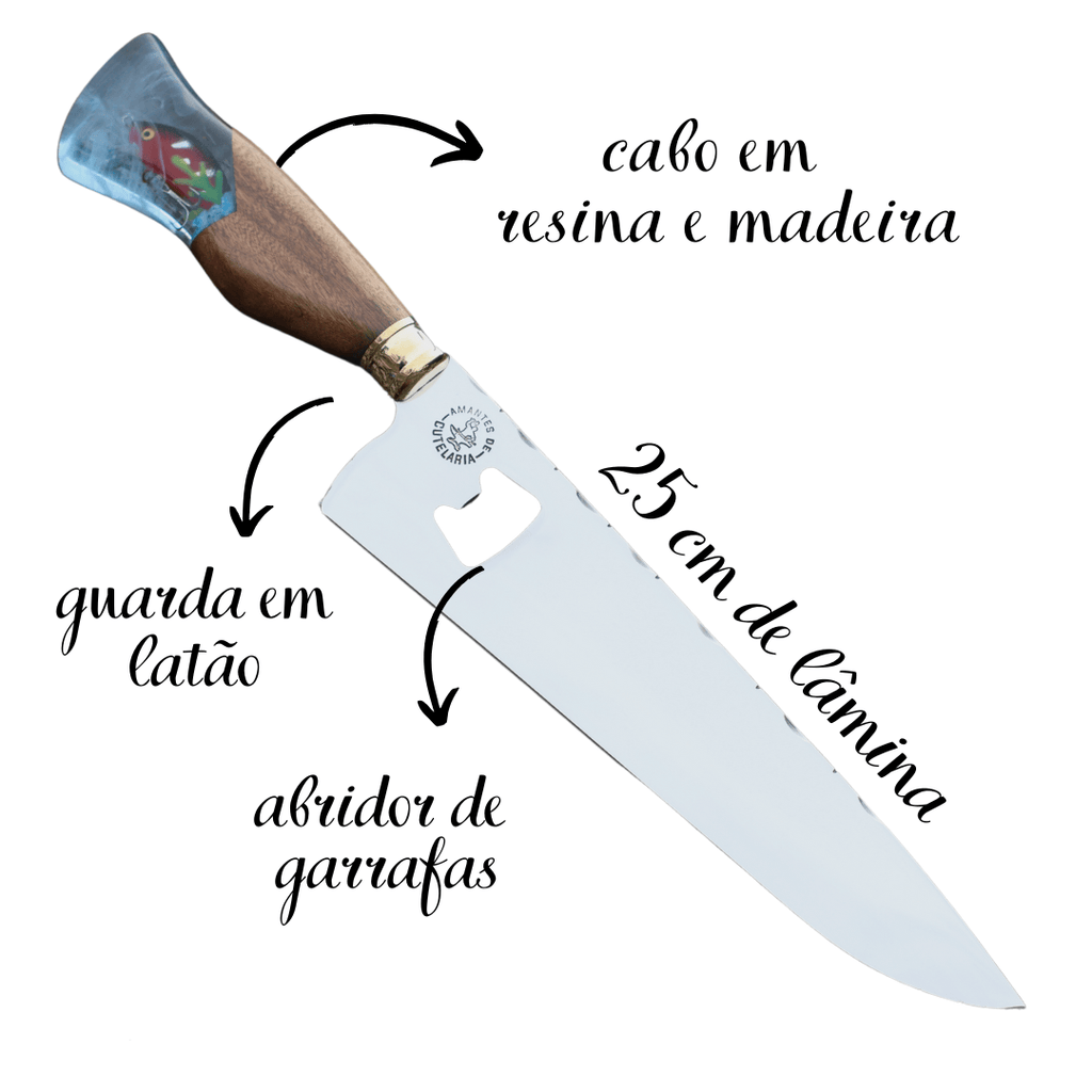 Cabo em Madeira Nobre e resina antibacteriana (cor e textura podem conter pequenas variações por ser feita de maneira artesanal em matéria-prima natural).